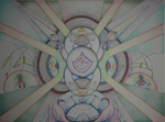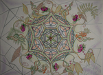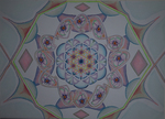 2016De basis van deze tekening is de Fruit of Life, maar vormt ook de basis van de Flower of life. Tevens wordt de Fruit of Life ook als de blauwdruk gezien van al wat zich in het heelal bevind. In deze geometrie zit ook de Davidster, een diamant, en in het midden een bloem verwerkt. Om deze bloem is de corona van de zon te zien. Deze corona komt langs rand van de buitenste cirkel terug, weliswaar in een andere kleursamenstelling. Dit symboliseert dat alle processen, eenvoudig tot zeer complex, aan herhaling onderhevig zijn en met elkaar in verbinding staat.